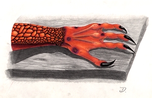 | Initially, the transformation only affected his hands, turning them into three fingered, black taloned redscaled things. Rather like this |